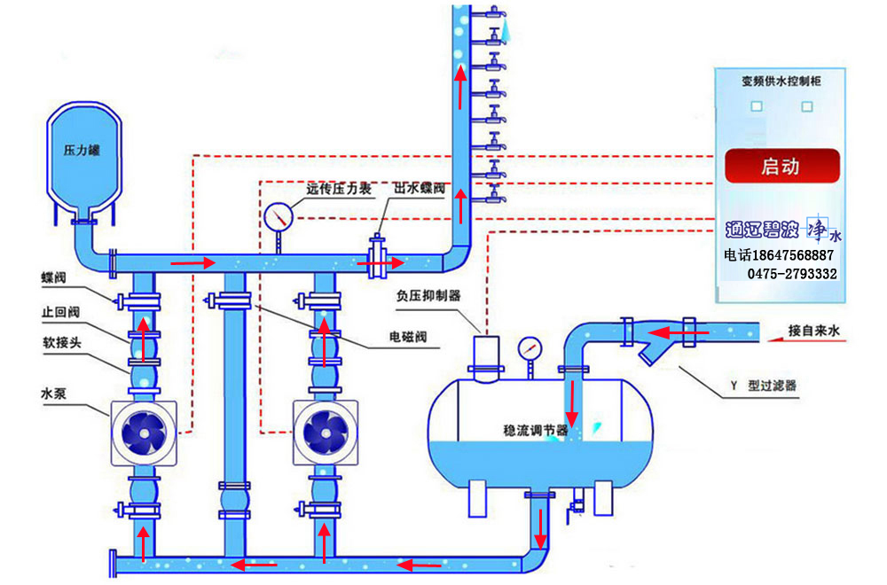 無負壓供水系統(tǒng)是采用先進的微機控制技術,結合高性能變頻調(diào)速器,根據(jù)生活用水量的多少自動調(diào)節(jié)水泵轉速或增減運行水泵的臺數(shù),實現(xiàn)恒壓供水。該系列無負壓供水系統(tǒng)設備壓力穩(wěn)定可靠,高效節(jié)能,是生活小區(qū)、自來水廠、工礦企業(yè)等理想的供水設備。